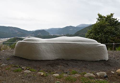作品《本人》は、設置場所である抜里の寺山(通称:ぼいんぼいん山)自身のかたちを180分の1スケールで形成している。