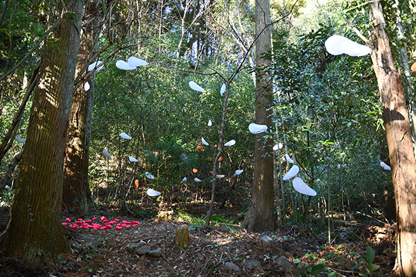 この作品は、かつて「こぶち」が仕掛けられていた薮全体を、さまざまな生き物たちのエネルギーが交差する場所と捉え、制作したインスタレーションです。