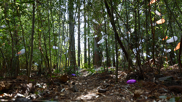 鑑賞者はこの竹をくぐり、餌を辿って薮を通り抜けていきます。薮のなかには、かつて「こぶち」に掛かって獲られてしまった鳥たち(カケス、ヤマガラ、ムクドリ、ヒヨドリ、ホオジロ、ツグミ、など)が舞っています。薮のなかの道は川沿いへと抜け、大井川鐵道の線路の脇を通り、もとの入り口付近へ戻してくれます。